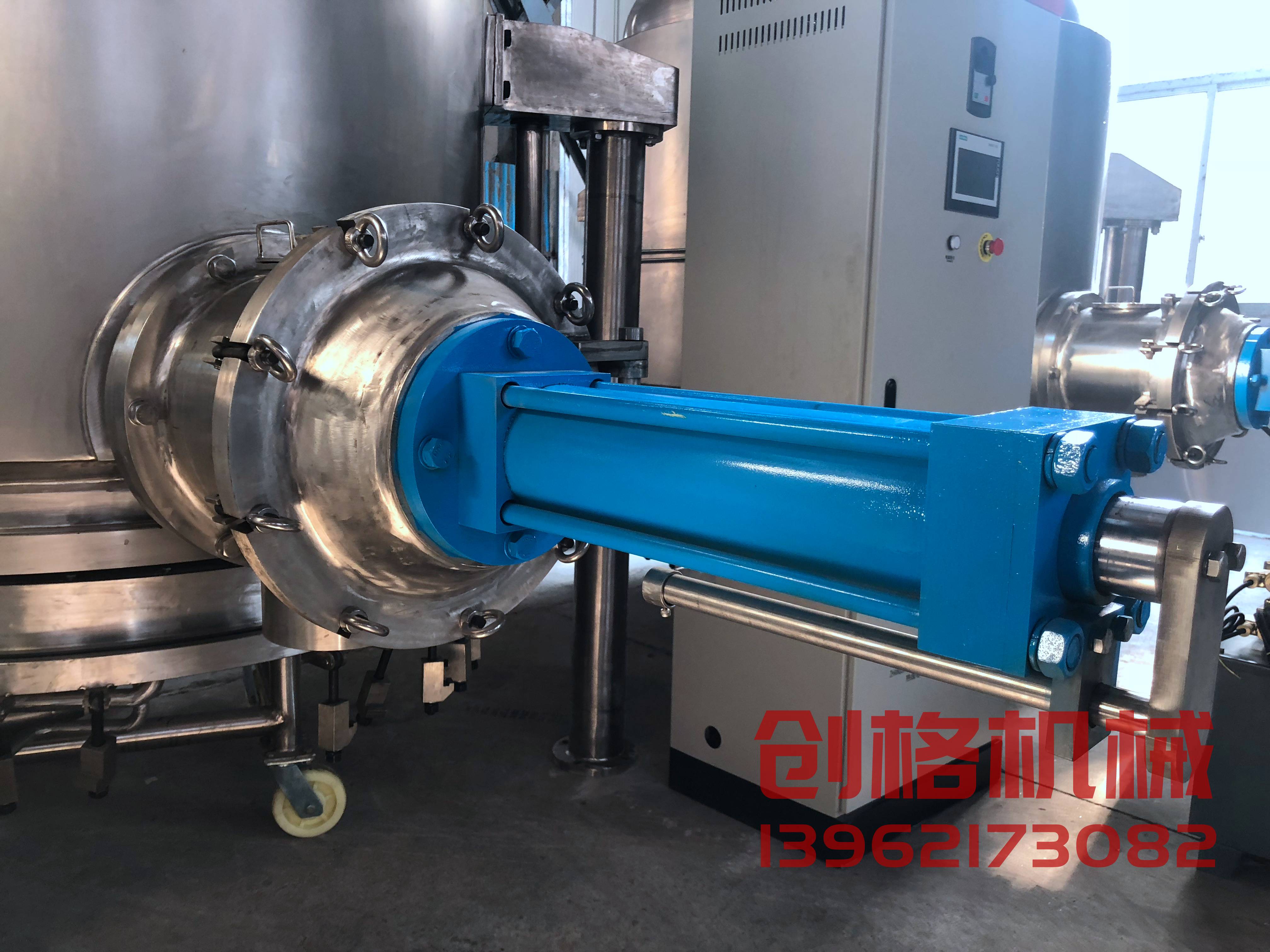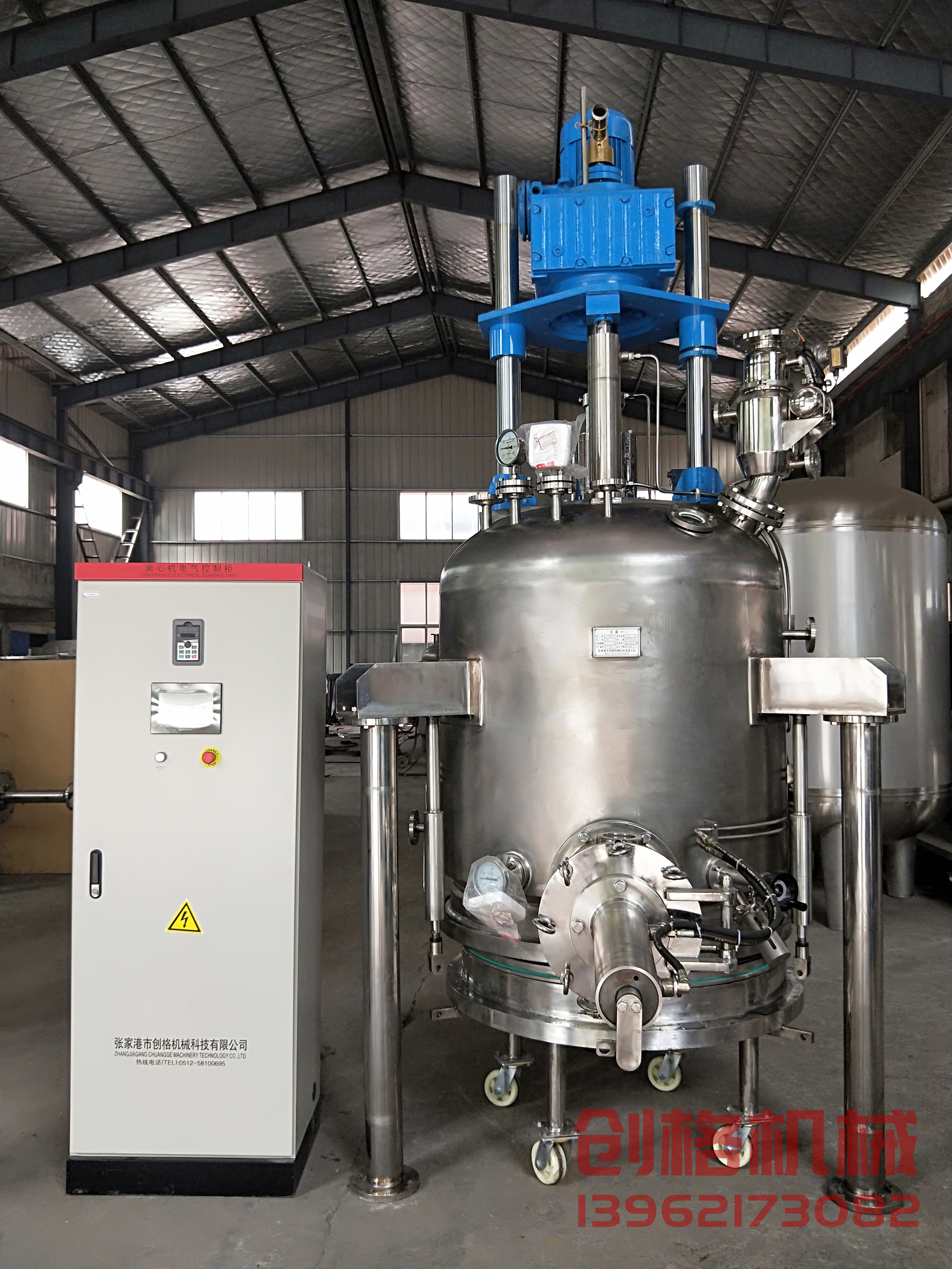 該設備為不銹鋼制立式容器,由罐體裝置、攪拌裝置、軸端密封裝置、升降機構、液壓裝置、罐底座(固定或可拆式)、加熱裝置、傳動機構、過濾裝置、卸料裝置、取樣裝置、洗滌(清洗)滅菌裝置、行程知識裝置、觸摸屏與手動操作控制裝置、液壓泵站、主電控柜(包括變頻器、PLC等),及其它電器附件等部件組成。實現機、電、儀一體化。